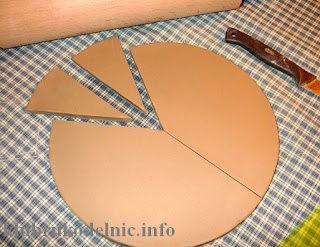 1. Раскатаем керамическую или полимерную глину каталкой для теста и по тарелке или миске острым ножом вырежем один большой круг и два маленьких (диаметром, равным пинг-понговым мячикам). Большой круг разделим пополам (лучше нитью, чтобы было ровно) и от каждой половины отрежем небольшой треугольник. Из одного круга получатся два ангелочка. Маленькие круги используем для волос ангелочков - из них нужно вырезать овал для лица а вилкой сделать полоски.