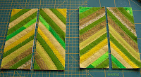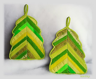 Этой кромки уже столько накопилось! Целый мешок. Кромки-это плотные полоски с краю ткани. Я их всегда обрезаю на новых тканях и сохраняю на будущие "шедЭвры" . Мои попытки пристроить хотя бы часть "добра" вылились в прихватки да очешники. Сегодня покажу прихватки.Как то странно так получилось, что зеленых кромок у меня больше всего оказалось. Ну и по ходу "пьесы" сочинились елки. Все просто-на кусок прокладочной ткани-у нас она называется нетканное полотно, на Кубани-межпроклад, а по сути-половая тряпка. Нашила кромки под углом 45 градусов. Разрезала пополам , и сложила половинки под углом к друг другу. Форму лучше не придумала нарисовать. И еще, если вы не хотите возиться с бейкой на сложных вогнуто-выпуклых местах, то и не надо. Достаточно пару раз обойти широким плотным зиг-загом.. На заднюю сторону пригодились учебные образцы со стежкой, на махровой ткани. Размер получился примерно 17*20см.