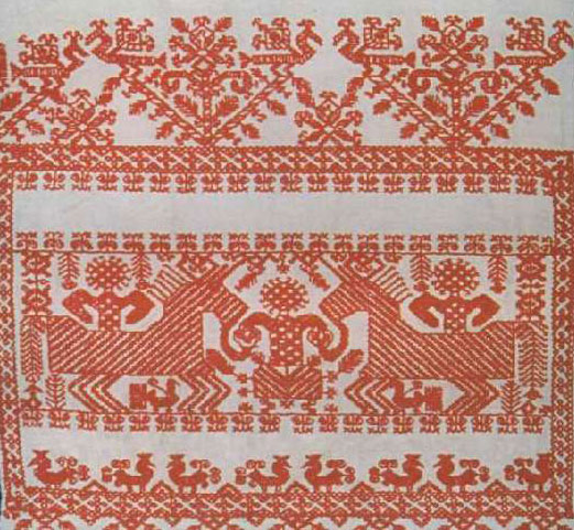 Старинный двусторонний вышивальный шов роспись, состоящий из мелких красных стежков, создавал на белом холсте тонкий графический узор.