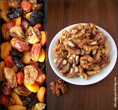 В общей сложности должно быть на 3 чашки орехов 2 и 1/2 чашки сухофруктов.