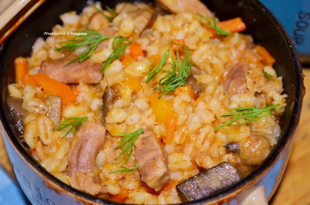 Мясо порезать небольшими кусочками. Обжарить до легкой корочки, добавить морковь с луком, немного томат пасты, потушить 3 мин, помешивая. Посолить, поперчить, добавить специи (у меня хмели-сунели, лавр лист, кориандр, тмин), чеснок и грибы. Добавить к мясу перловку, перемешать. Разложить по горшочкам, залить водой так, чтоб слегка покрыла мясо с перловкой. Закрыть крышечками. Тушить в духовке 1 час. При подаче перемешать, посыпать зеленью.