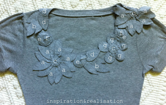 *** to create the 3D effect, you'll need to sew only the edges of the parts onto your t-shirt pinching the middle of the petals / leaves / or rounds***