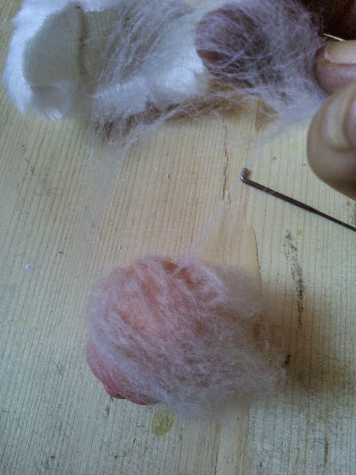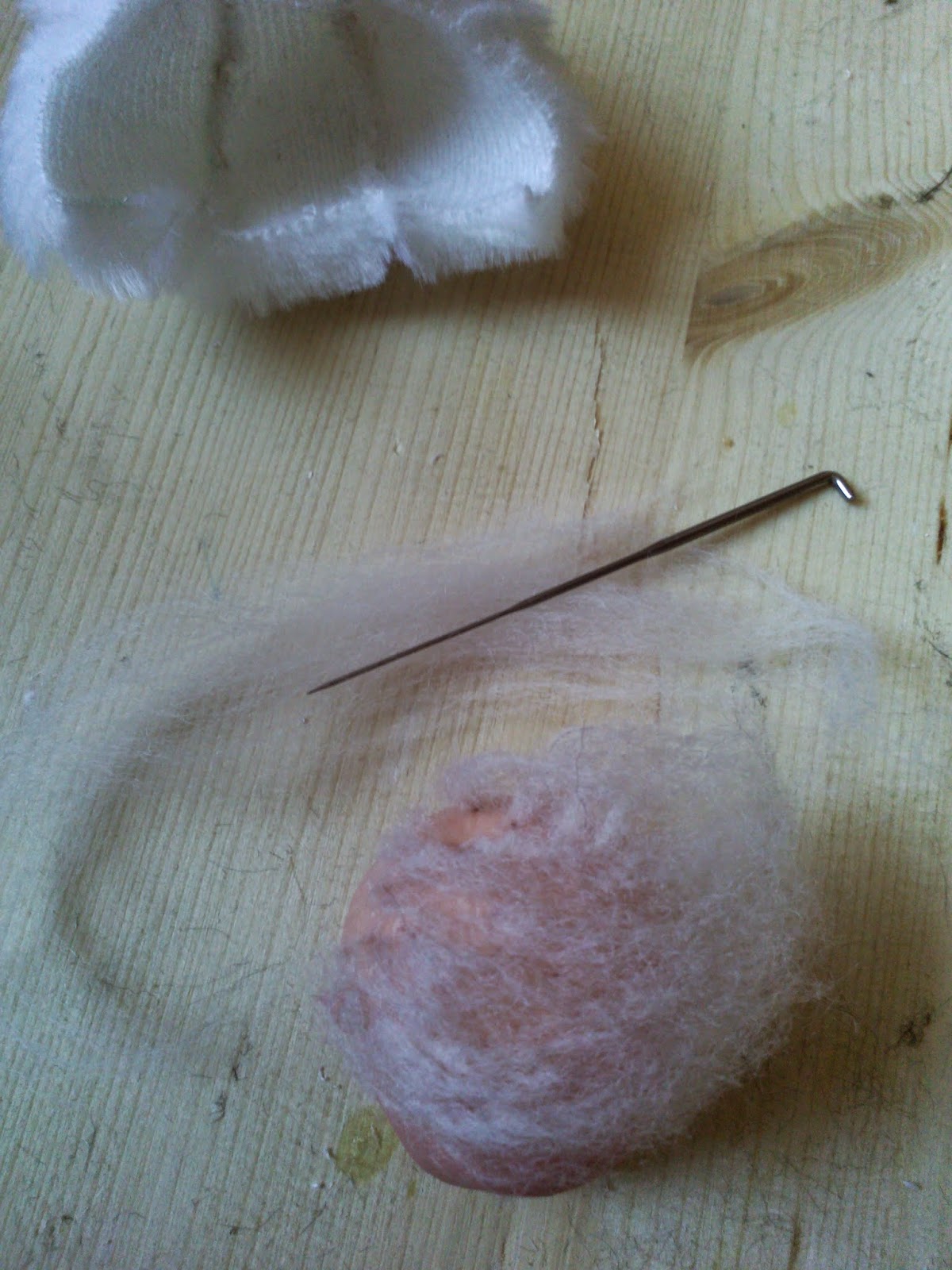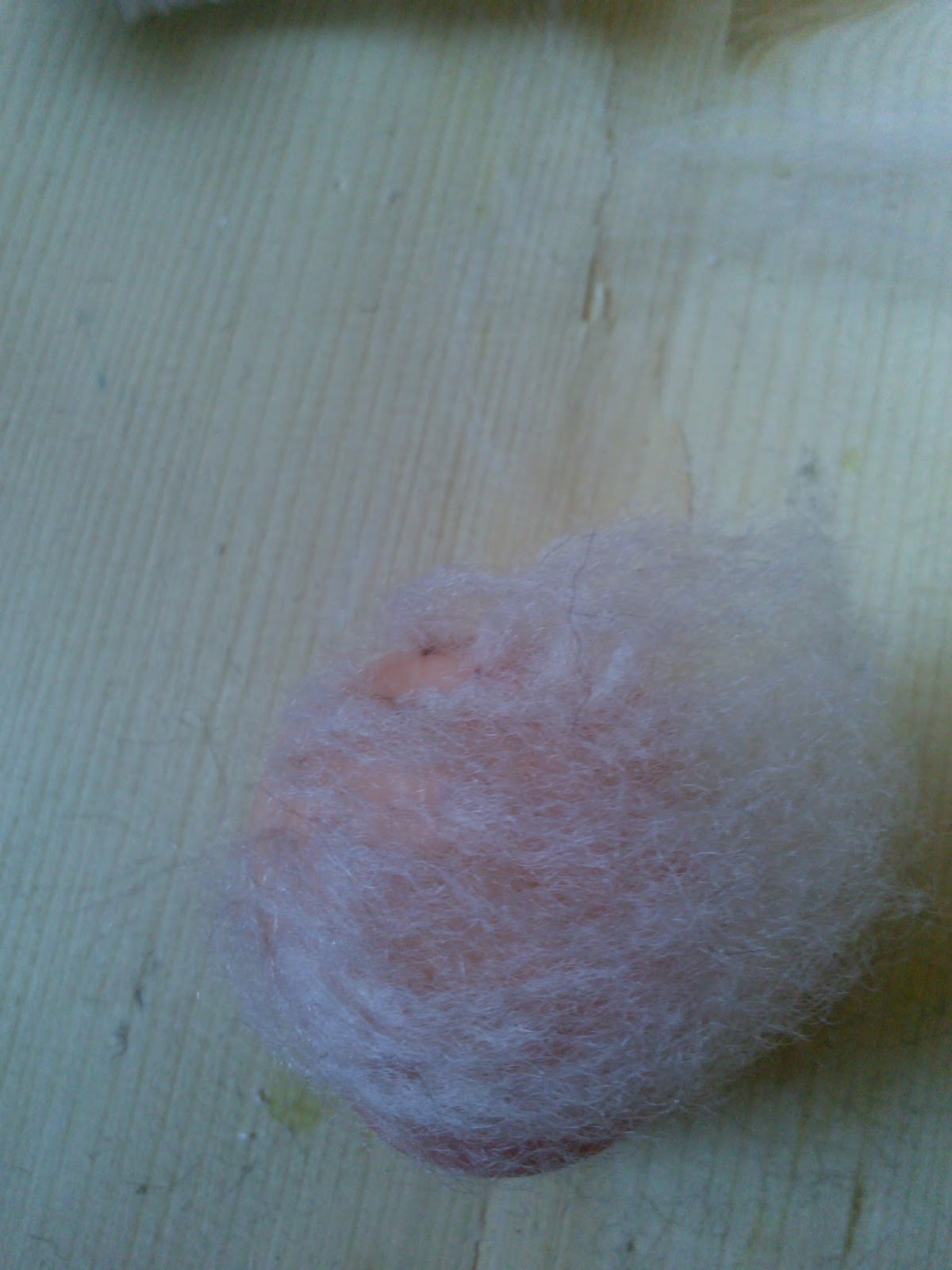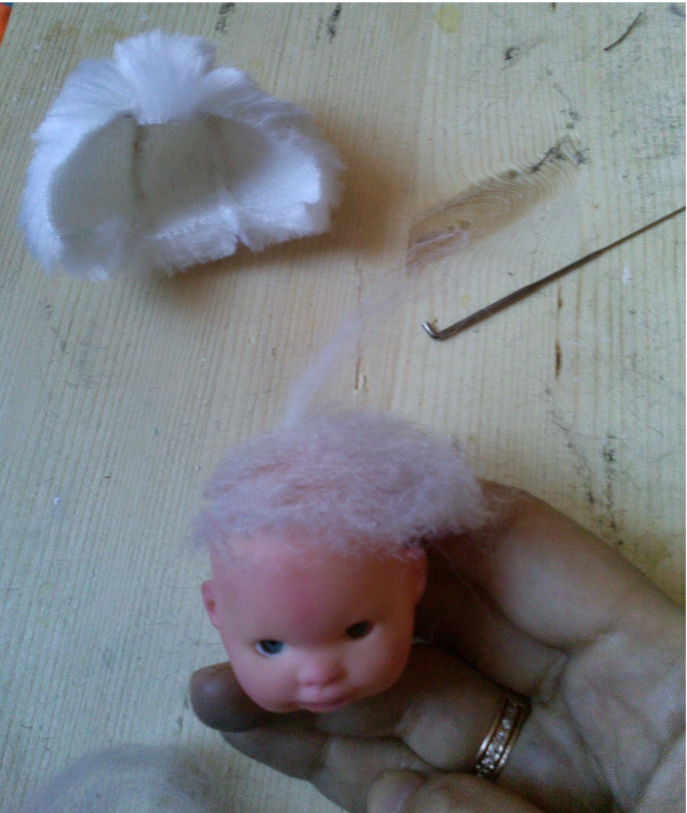 Мой пупсик был лысенький, и я решила наградить его волосиками. Но не просто так а с помощью иглы для валяния и шерсти, иголку вводила очень осторожно не спеша,  потом вытягивала шерсть и так по одному пучку. Да конечно можно было просто приклеить, но мне захотелось поэкспериментировать))))