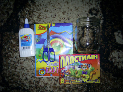 Для изготовления поделки подготовьте стеклянную банку, цветной картон, пластилин, ножницы и клей.