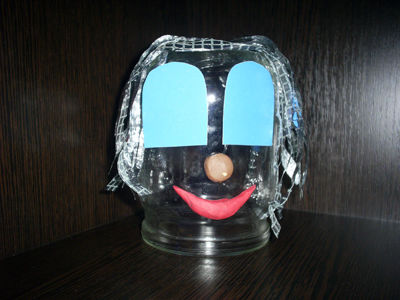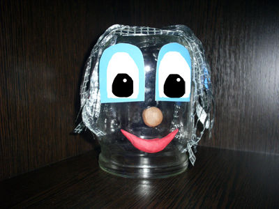 Из цветной бумаги вырезаем глаза. У нас они голубого цвета. Из пластилина сделаем нос человечку и рот. Его волосы будут из фольги. Все приклеиваем к банке клеем ПВА.
