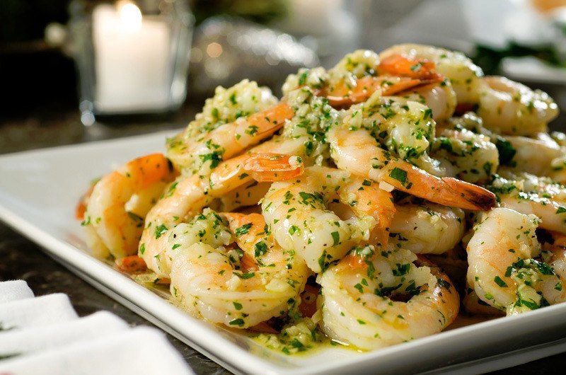 Добавьте к прожаренному чесноку в сковороду уксус и лимонный сок и доведите до кипения. Добавьте немного оливкового масла. Переложите креветки в сковороду, добавьте нарезанную петрушку. Хорошо перемешайте и приправьте солью и перцем.