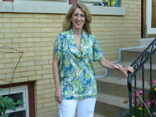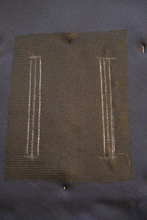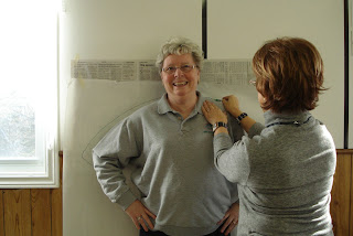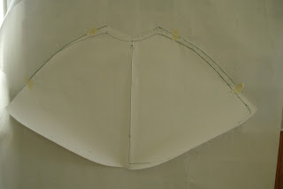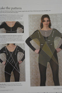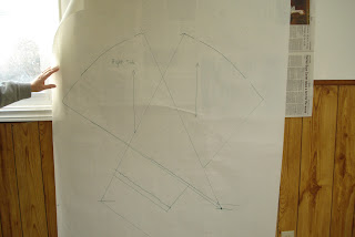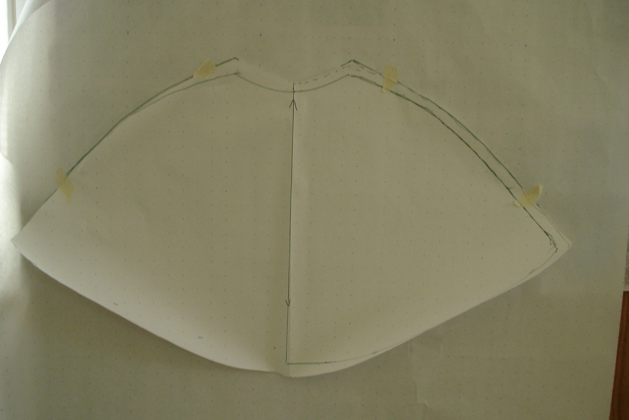 1. Make up the pattern as outlined in the magazine instructions. Be sure to mark the left and right sides of the front pattern pieces. Also, be sure to draw the grain line on all pieces starting with the center back .Just ignore the extra lines drawn in the bottom photo. We were trying to decide on the length we wanted.