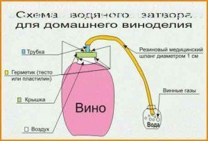 В таком состоянии он должен простоять одну неделю. По истечении этого срока следует добавить оставшиеся две трети сиропа, тщательно перемешать и опять закрыть бутыль водяным затвором, схема которого изображена на рисунке.