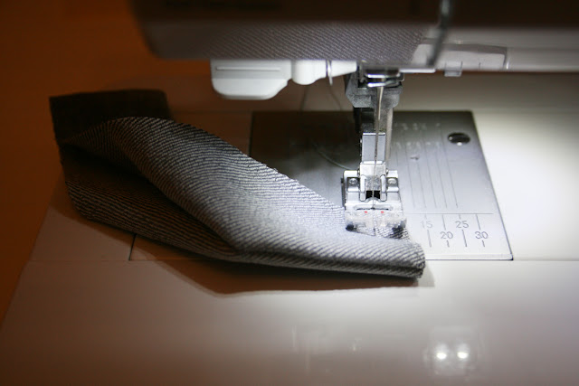 Откосок двойной со сгибом, короткие срезы вырха и низа стачать изнутри, вывернуть и приутюжить. Оставшийся необработанный срез обметать.