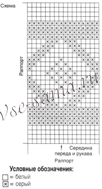 Перед и спинка: на круговые спицы №3,5 наберите серой нитью (172)188(208)224 п., вяжите вкруговую 5 см резинкой 2x2. Затем поменяйте спицы на №4 и вяжите 4 ряда лиц. гладью, при этом в первом ряду равномерно убавьте количество петель до(160)176(192)208 п. Вяжите рисунком по схеме, рассчитайте начало рисунка от стрелки, обозначающей середину. После 1 раппорта рисунка вяжите серой нитью (4)5(6)7 см. Затем провяжите рисунок еще 1 раз, после этого провяжите (3)4(5)6 см серой нитью. Затем для пройм закройте по бокам петли следующим образом: закройте первые (4)4(4)5 п., вяжите (73)80(88)94 п., закройте (7)8(8)10 п., вяжите (73)80(88)94 п, закройте (3)4(4)5 п. Отложите петли.