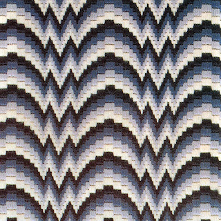 (если это классический Flame stitch, то рисунок складывается из симметричных или ассиметричных подъемов и спусков, образуя "языки пламени" - чем круче смещение, тем острее "пламя". При небольшом смещении, образуются плавные линии).