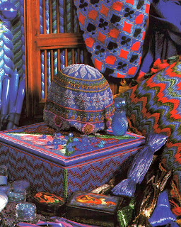 Предметы вышитые в этом стиле производились в небольших семейных мастерских. Традиционно это была обивка для мягкой мебели, подушки и покрывала выполненные геометрическим рисунком "зиг-заг" или ромбами с использованием тонких шерстяных ниток.
