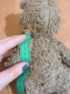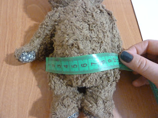 Первая мерка - это длина кофточки. Измеряем ее на середине спины мишки от основания головы до предполагаемой точки низа.
