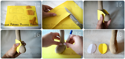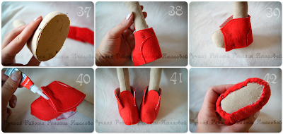 Те, кто хочет сделать снимающиеся ботинки ( а у меня они пришиваются на мертво) как на фото №37 картонную подошву и закрепляют булавками, так чтобы булавки в последствие не мешали и были практически незаметны. На мертво пришивающие ботинки пропускают этот момент. Далее накалываем бочек, чтобы пятка сидела ровно, а снизу остался отступ пол сантиметра. Закрепляем по бокам булавками отступив 1-1,5 см от края как на фото №39. Прикладываем носок, так же оставляя свободный край у подошвы и склеиваем или сшиваем носок и бочка (фото №40). Свободные края пришиваем к стопе. И если вы делаете снимающиеся ботинки , то свободные края приклеиваете на картонную подошву.