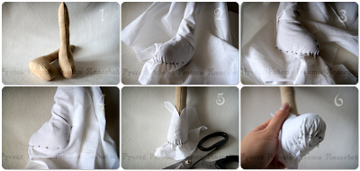Для таких ботинок нужна нога на плоской подошве (как на первом фото), о том как сделать такую для игрушки тильда подробно написано у Нади Панкив. Не плотно оборачиваем ногу, как-будто на ней ботинок, обычной хлопковой тканюшкей, обязательно чтобы она не растягивалась. Ткань накладывается по косой относительно поперечного шва. Закрепляем булавками, стык ткани делаем сзади (фото №4) Обрезаем лишнюю ткань, чтобы не мешала. Делаем разрез посередине, чтобы ткань не тянуло (фото №5). Хвостики плотно натягиваем на подошву, нужно постараться, чтобы складок было как можно меньше.