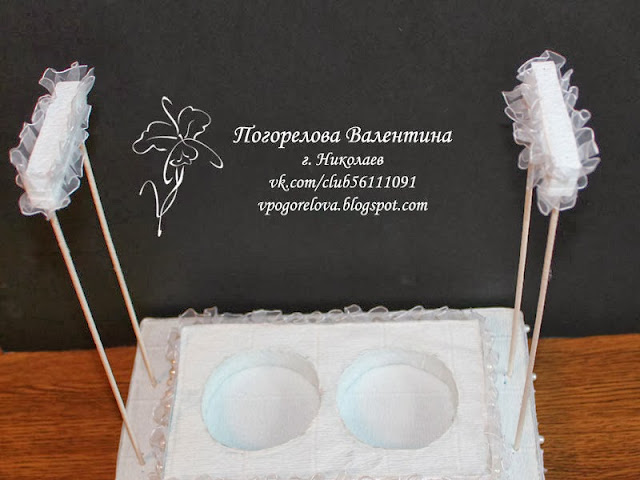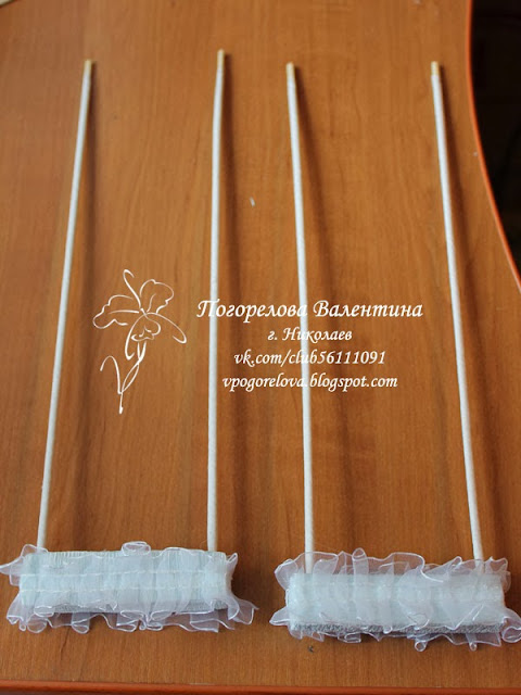12. Украшаем кружевом в виде оборки боковые держатели для арки и крепим в них подготовленные шпажки. (Я для надежности капнула немного термоклея)