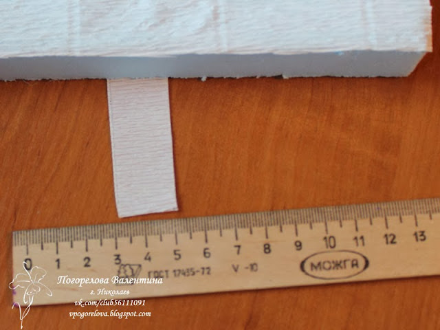 6. Полосой шириной 4 см (выкраиваем по тянущейся стороне гофрированной бумаги) обклеиваем бока подставки.
