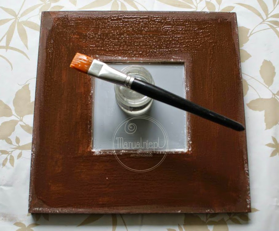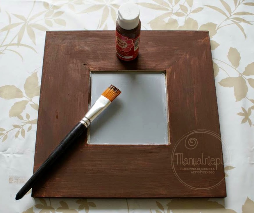 На поверхности, вы уже можете поставить первый слой акриловой краски. В этом случае, темно-коричневого цвета из обжаренного и этот цвет виден в пазах. ( Информация для начинающих и для тех, кто не хочет использовать Крак и не przecierek - на этом этапе вы можете пойти дальше и прекратить использование нарушение продукции или потертый шик эффект, или из одного и другого, потому что это не является неотъемлемой частью декупаж, это просто дополнительная эффекты. Затем, после резервного и шлифования сразу рисует зеркало яркий цвет краски). Потому что мы хотим, чтобы краска была применена гладко, используя мягкую кисть с нейлоновой щетиной. Не очень толстый слой краски. Если бы мы хотели, чтобы получить равномерное покрытие, действие придется повторить. Мы сейчас как раз один слой.
