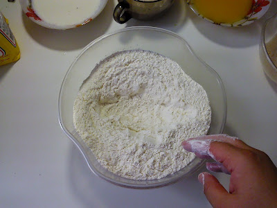 Всыпаем муку в тару для замеса, делаем углубление и последовательно выливаем туда все подготовленные ингредиенты (жиры в последнюю очередь)