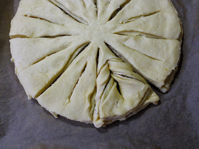 После таких манипуляций у нас получается вот такая красота. Я украсила еще розочкой и листиками из остатков теста. Оставляем красоту на расстойку, на 15-20 минут: