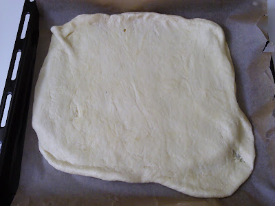 Итак, раскатываем пласт теста, толщиной 0,3-0,5 см, примерно намечаем окружность (у меня с помощью крупной тарелки)