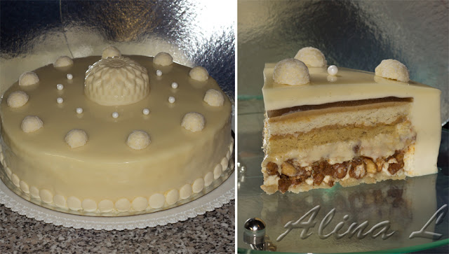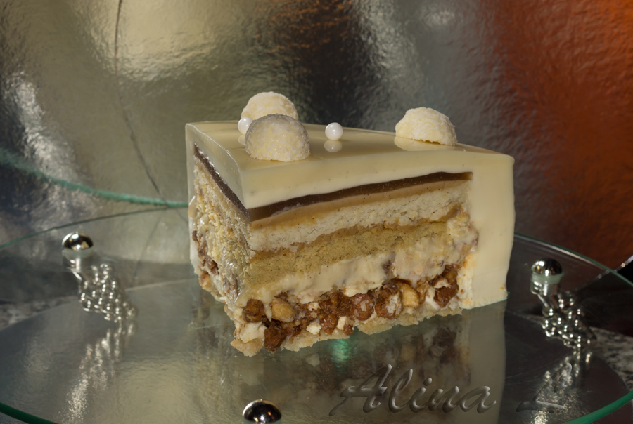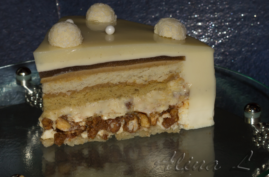 Но перейдем к торту)) Даже за одну только возможность освоить ванильную глазурь, этот рецепт стоит каждой минуты потраченного на него времени. Ванильно-миндальный кранч следующий компонент, который я отметила для себя. Он будет хорош в шоколадно-карамельных тортах. Ванильный прозрачный гель меня настораживал. Всего лишь ванильное желе, слишком просто, но он потрясающе раскрылся в сочетании с кремом шантильи, кроме того он замечательно смотрится на разрезе. Мне кажется, что вместе с V8 я перешла на новый уровень, немножечко подросла как кондитер, я просто счастлива, что я его сделала))
