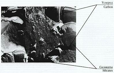 Структура шунгитовой породы в растровом электронном микроскопе: Область сканирования – 100 ´ 100 мкм, разрешение – 0,3 нм, увеличение – 500000 раз. Стрелками показаны силикатный каркас из мелкодисперстного кварца, размерами 1–10 мкм и равномерно распределенный углерод