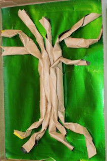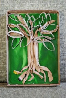 Получившиеся рулончики стали приклеивать к коробке, чтобы у нас образовалось дерево: корни, ствол, ветки