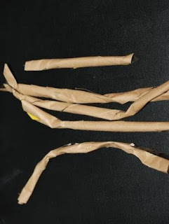У меня был пакет, который был коричневого цвета внутри и нам он очень подошел. Мы разрезали его на полоски (Даша резала сама, так как насколько ровно мы нарежем, не важно). Нарезанные полоски скрутили и я закрепила их степлером, чтобы они не раскрутились. Можно также использовать клей.