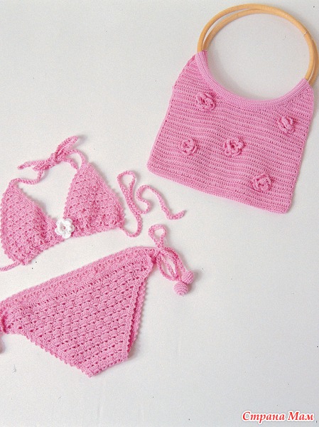 Пляжный вариант: связанное крючком бикини с сумочкой.