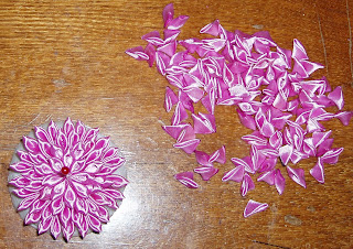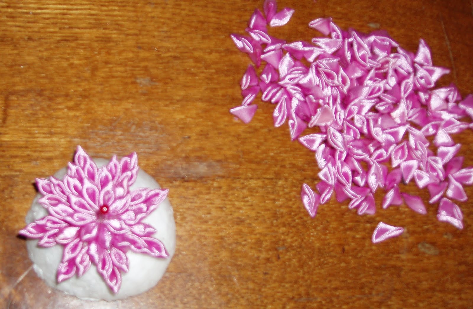 И еще ремарочка, такие лепестки удобнее делать паяльником или выжигателем, тогда сложенную ленту просто обрезаем паяльником или выжигателем под металлическую линейку под углом)))