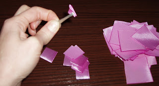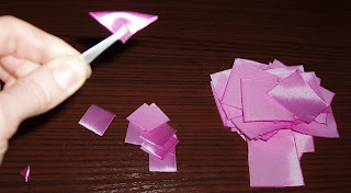 Нарезаем полоски из ленты (длина и ширина зависит от желаемого конечного размера лепестка). У меня лента 2,5 см шириной, я нарезала полоски длиной 8 см.