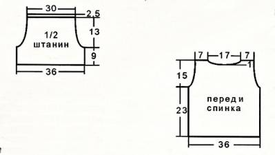 Набрать 100 п. и вязать лиц. гладью. На высоте 9 см убавить с обеих сторон по 4 п., 3 п., 2 п., 1 п. Затем вязать прямо до высоты 22 см и отложить работу. Аналогично связать вторую штанину. П. обеих штанин собрать на 1 спицу. Выполнить 2,5 см двойной резинкой-кулиской, после чего п. закрыть. В середине левой штанины вышить мотив по схеме. Контуры мотива вышить тонкой нитью коричневого цвета швом «назад иголка». Выполнить швы. В кулиску продернуть резинку. Низ шортов обвязать 1 р. ст. б/н и 5 р. ажурной отделки.