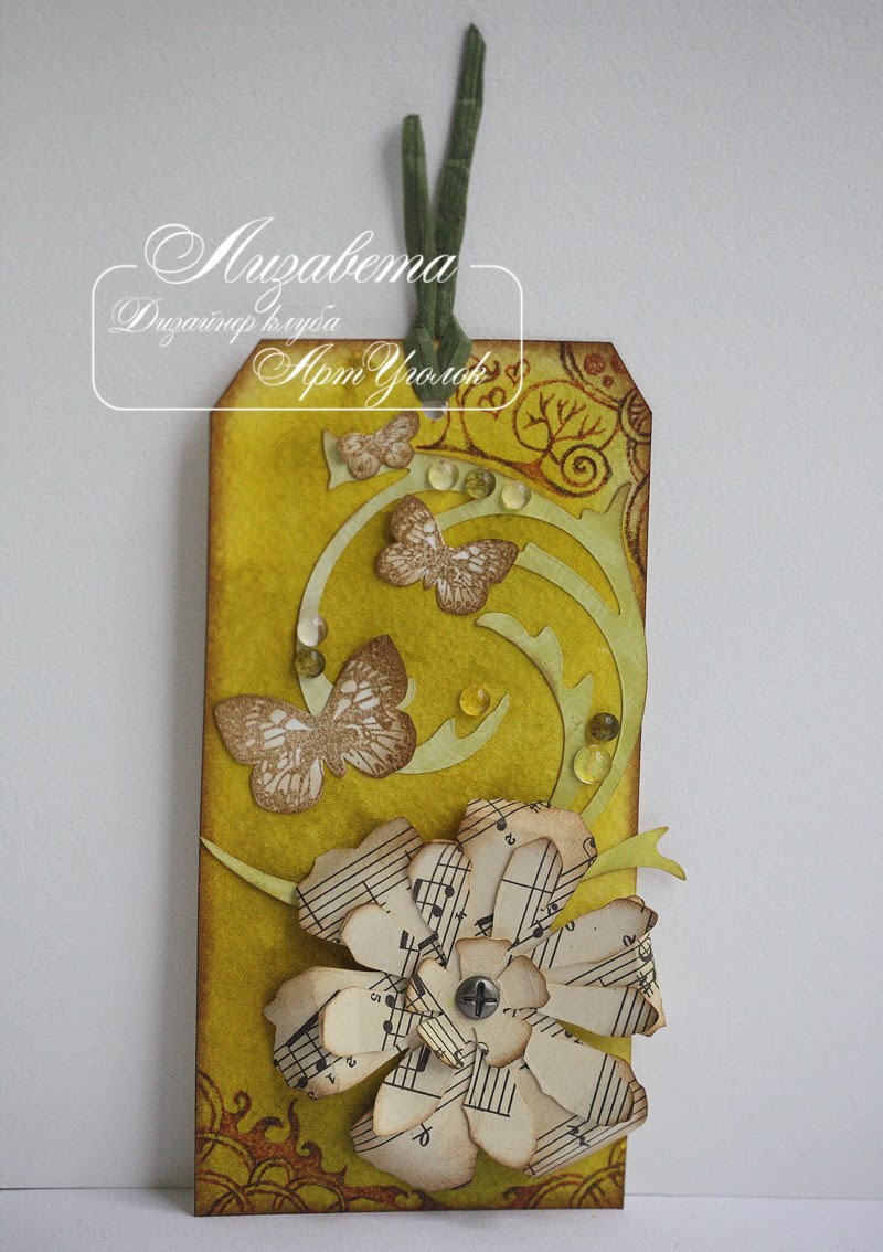 Сегодня я опять покажу вам один из своих тегов. И на его примере мы посмотрим как можно еще более быстрым способом (по сравнению с тем, что я показывала в прошлом месяце) сделать оригинальный фон для тега, открыточки или даже странички. Также мы с вами сделаем оригинальный цветок из нотной бумаги.