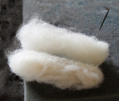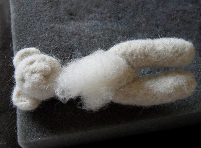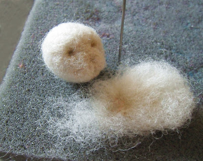 Голова мишки готова. Теперь берем довольно много шерсти, чтобы свалять туловище.Сваливаем тельце немного вытянутой, яйцевидной, формы, оставляя недовалянным место прикрепления туловища к голове.
