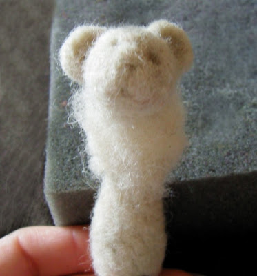 Сначала валяем что-то похожее по форме на яйцо, потом, уплотняя, формируем мордочку мишки с ямочками для глаз и носа.