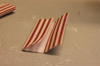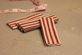 7. Cut four 5.5 inch by 4 inch rectangles of fabric. I used the lining fabric for my handle. Fold and iron each rectangle in half, matching the two four inch sides together. Open the fabric and fold in each side into the center crease made by ironing. Fold in half again and iron. Top stitch along each long side.