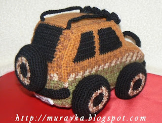 Я использовала пряжу YarnArt (35% шерсть, 65% акрил, 260 м/100 г) секционного крашения. Это благодаря ей джип слегка смахивает на такси:)) Первую деталь вязала как ляжет цвет, дальше пришлось подбирать, часто обрывая нить и присоединяя с нужного места. Однотонной будет немного полегче.