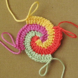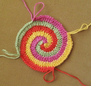 Круги вяжем по спирали. Во внутреннем круге делаем отверстие для ободка. Внешний разноцветный вяжем сразу от четырех клубочков. Вот так: