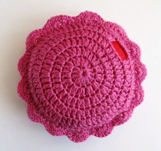 Когда все четыре круга готовы, нужно сложить их по 2 вместе и обвязать двумя рядами обвязки, указанными на схеме (предварительно слегка отпарьте, едва касаясь утюгом). Не забудьте поместить внутрь подушечки.