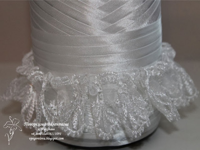 12. Делаем ряд из кружева и продолжаем обклеивать кусочками белой ленты. Длина этих лент должна быть побольше - около 23-25 см.