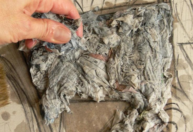 5. Руками из газет моделируем подходящие формы и клеим на основу. Сначала делаются мотивы на заднем плане и постепенно переходим на передний. Клея нужно использовать достаточное количество, чтобы бумага хорошо держалась.