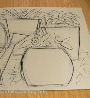 1. В качестве основания выберем плотный картон, фанеру, ДВП размером 50х70 см. На эту доску нарисуем (или скопируем) натюрморт, например, несколько цветочных горшков, чайник, кувшин и т.д.