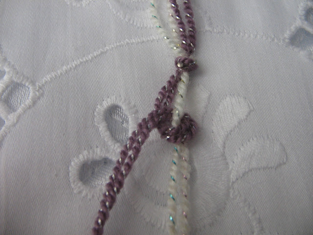 2. Возьми второй отрезок тесьмы, равный по длине первому с завязанными узлами. Проденьте его последовательно в петли первой тесьмы и завяжите его концы.