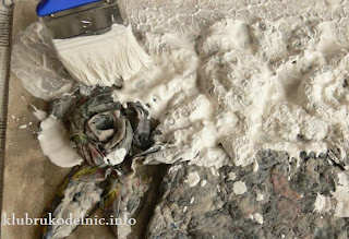8. Алебастр сыпем в воду до тех пор, пока на воде начнут образовываться белые шапочки. Немного оставим его пропитаться водой и размешаем. Еще жидкий алебастр начнем наносить кистью на задний план. Концом шпателя вырежем листики растений.