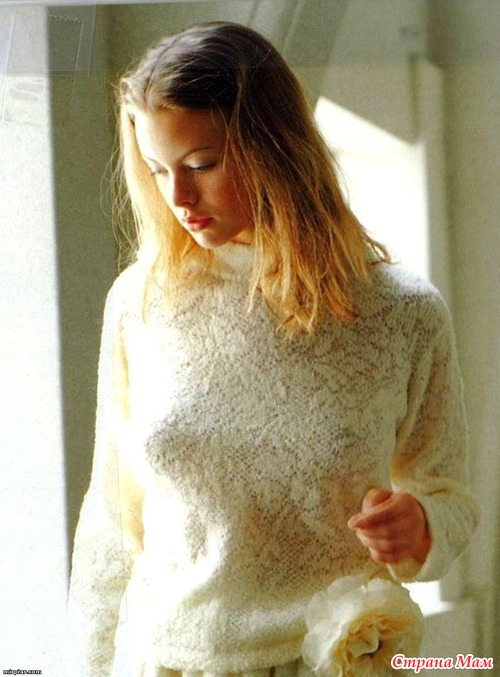Очень красивый вязаный свитер с пелериной выполнен в смешанной технике: основная часть связана крючком, а ворот, пелерина и манжеты - спицами. Сочетание ажурной и рельефной вязки придает изделию некоторую пикантность.