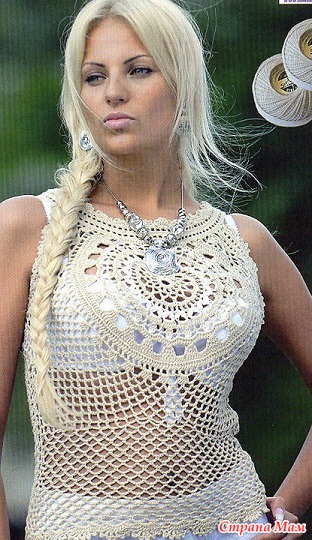 Описание : Потребуется 350 г однотонной пряжи (100% хлопок), 100 г фантазийной пряжи (100% полиамида). Крючок № 2 и № 2,5; круговые спицы № 5; декоративные бретели; резинка.
