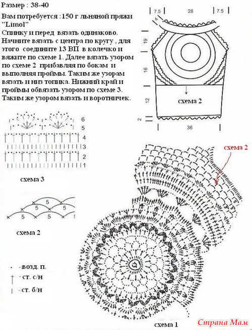 Связать цепочку из 97 (105) 113 возд. п. + 3 возд. п. подъема и вязать основным узором, при этом отметить среднюю петлю. Одновременно от наборного края прибавить для придания формы с обеих сторон в каждом ряду 1 п., включая прибавляемые петли в узор, и убавить с обеих сторон от средней петли 1 п. (для этого не выполнить во 2-м и 5-м р. схемы возд. п. до и после средней петли и в остальных рядах провязывать петлю до и после средней петли со средней петли вместе). Через 36 см = 43 р. от наборного края работу закончить. Вязать верхнюю часть. Для этого присоединить нить к 6-й п. перед средней петлей и связать 13 п. основным узором, начав со 2-го р. схемы и заменить 1-й и последний ст. с/н на 1 ст. б/н. Затем расширить основной узор с обеих сторон, прибавив в каждом следующием ряду 7 х 3 и 4 х 4 п. (8 х 4 и 3 х 3 п.) 10 х 4 и 1 х 5 п. = 87 (95) 103 п. Через 15 см от начала верхней части оставить для пройм с обеих сторон 10 п. = 77 (85) 93 п. Через 33 см от начала верхней части работу закончить.