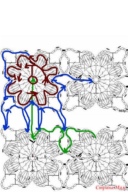 Плотность вязания: размер мотива, связанного с 1-го по 7-й ряды схемы крючком №1,5 = 9 х 9 см, измерено по диагонали; размер мотива, связанного с 1-го по 6-й ряды схемы крючком №1,5 = 7,5 х 7,5 см, измерено по диагонали.