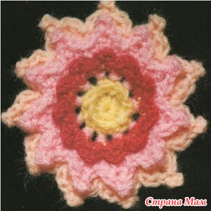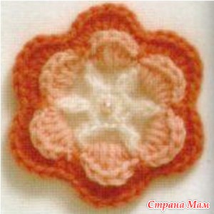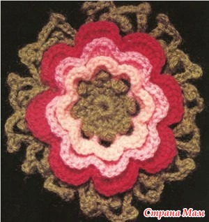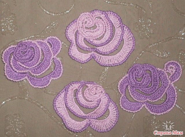 Набирала цепочку из 20 петель, потом один полустолбик, а далее по 2 столбика с накидом в каждую петлю, получается такая завитушка. Обвязала вокруг рачьим шагом, присоединив в одном месте, чтобы получилось фигура типа девятки. Затем повернула на изнанку и, протягивая петли, дошла до нужного места, где лепесток будет начинаться и связала цепочку из стольких петель, чтобы хватало на половину этой фигуры по кругу, связала 2-3 воздушные петли, присоединила, повернула и начала вязать на цепочке столбики с двумя накидами, пока не заполнила все пространство до начала цепочки. Присоединилась к первой фигуре. Затем ниткой другого цвета обвязала этот ряд рачьим шагом, там нитку оборвала. Вернулась к началу, продвинулась до нужного места и опять цепочку. Затем на ней снова столбики, разбивая их по количеству накидов на два лепестка как бы (у меня треть – один. лепесток, потом другой… Снова повернуть. Теперь цепочка до места разделения лепестков, потом вторая до нужного места. Столбики с двумя, а местами и с тремя накидами, как вам нравится, чтобы край лепестка был волнистый. Каждый ряд обвязывала другой ниткой. Основная нить не обрывается, потому что все время возвращаетесь на то место, откуда ушли, а другой цвет каждый раз обрезала. Лепестки при движении раздвигаются, я их с изнанки незаметно пришивала друг к другу, чтобы не расходились. За счет рачьего шага этого не видно… Лепестки можно делать по-разному, как фантазия подскажет…Можно вверху добавить маленький. У меня почти все розочки разные